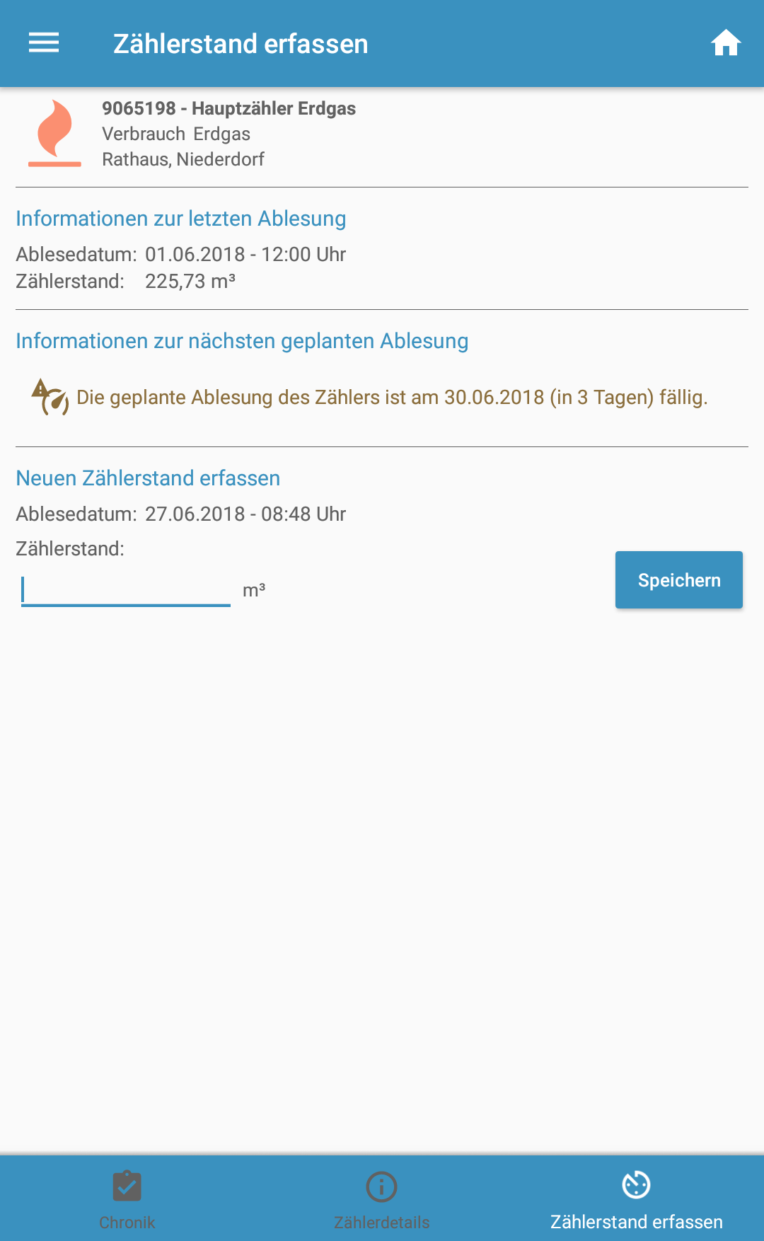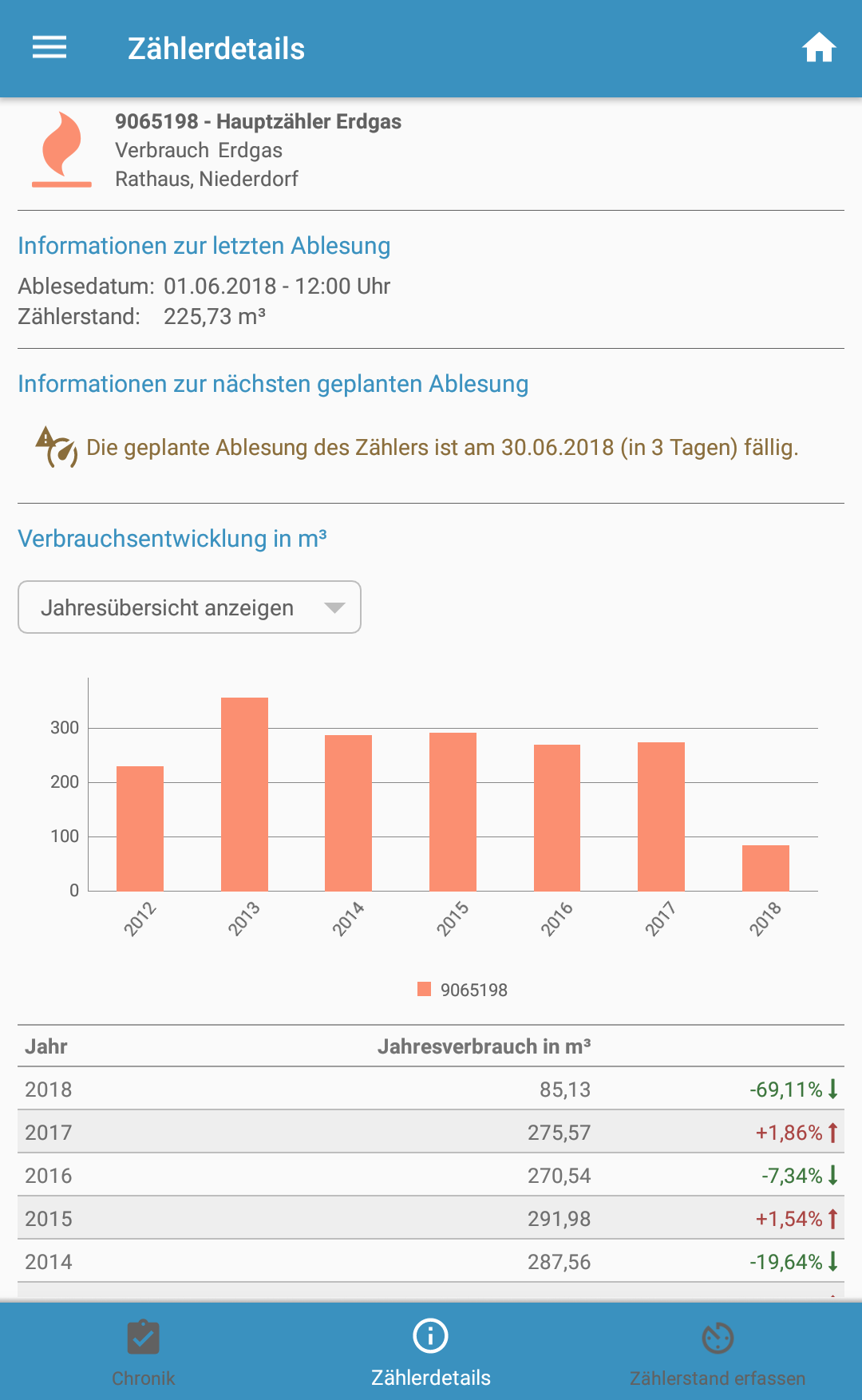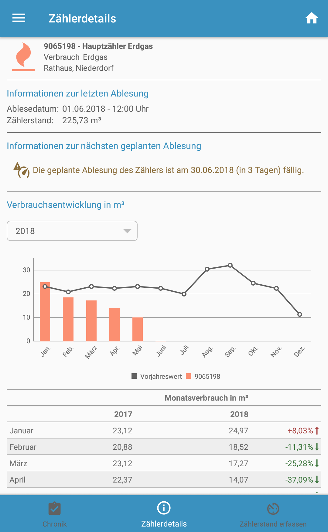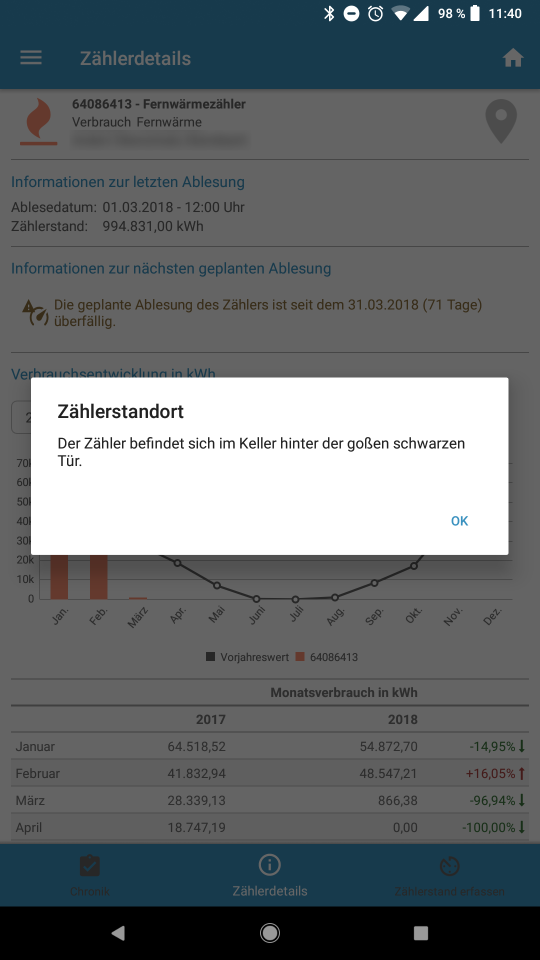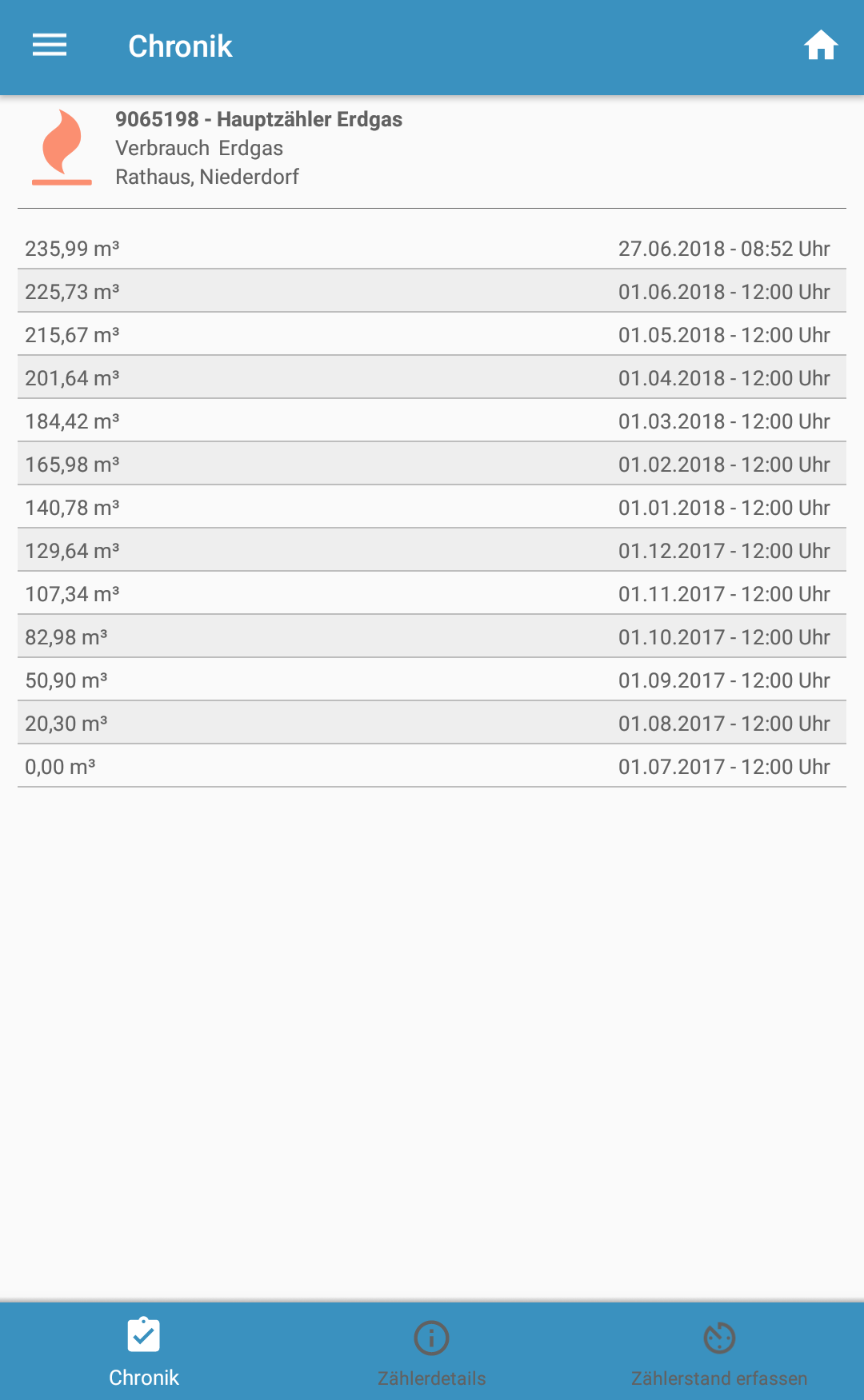 Eine wei­te­re neue Funk­ti­on ist die Erfas­sungs­chro­nik, wel­che eben­so für einen aus­ge­wähl­ten Zäh­ler auf­ge­ru­fen wer­den kann. Eigens hin­zu­ge­füg­te Zäh­ler­stän­de kön­nen mit der Ver­si­on 1.2.0 eben­falls dar­ge­stellt werden.